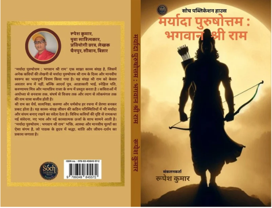 बिहार के सीवान जिले के चैनपुर गाँव के युवा साहित्यकार, कवि एवं लेखक, पाँच पुस्तकों के रचनाकार तथा पूर्व में चार पुस्तकों के सफल संपादक रूपेश कुमार द्वारा संपादित पुस्तक “मर्यादा पुरुषोत्तम : भगवान श्री राम” एक अत्यंत महत्त्वपूर्ण, भावपूर्ण और विचारोत्तेजक साहित्यिक कृति है। इस पुस्तक में भगवान श्री राम के आदर्श जीवन, उनके गुणों, मर्यादाओं और पुरुषार्थ का विविध कवियों द्वारा अपनी-अपनी साहित्यिक रचनाओं के माध्यम से प्रभावशाली एवं सार्थक चित्रण किया गया है। इस संग्रह में कुलदीप सिंह रुहेला, सुमन झा ‘माहे’, गरिमा लखनवी, आकाश शर्मा ‘आज़ाद’, रेखा चौरसिया, पूनम जैन अग्रवाल ‘चाँदनी’, शाहाना परवीन ‘शान’, सुनील कुमार ‘सत्यार्थी’, संध्या चतुर्वेदी, वर्तिका अग्रवाल ‘वरदा’, दया भट्ट ‘दया’, डॉ. अनामिका वैश्य ‘आईना’, अतुल कुमार शर्मा, डॉ. सुनीता मिश्रा, मुन्नी कुमारी, डॉ. टीना राव, डॉ. सुमन शर्मा, देवेंद्र कुमार शर्मा, गीता रानी, नरेंद्र सिंह भरथला ‘कुंवर सा’, संजय ‘सरल’, श्रद्धा सिंह ‘विदुषी’, अनीता सिंघल, नीतू नागर ‘अंबर’, कवि प्रशांत सोऊ, भक्ति दीपक, रजत त्यागी, डॉ. कुमारी प्रियंका, योग्यता राज चौहान, महेंद्र कुमार मिठारवाल, आर्ची कुमारी, जगदीश प्रसाद गबेल, देवाशीष तिवारी, डॉ. शरद शर्मा, रुचिता माथुर, श्रीनिवास यन, डॉ. प्रशांत पंकज, डॉ. ऋचा बिश्वाल, उज्जवल कुमार श्रीवास्तव, सत्य सुरेन्द्र, श्रीमती पुष्पा गबेल, डॉ. सरला सिंह ‘स्निग्धा’, डॉ. कनक लता जैन, डॉ. नम्रता कुमारी, इन्दु कुमारी, जयति नारायण तिवारी, डॉ. सोनल मिश्रा एवं डॉ. नीलू शुक्ला ‘समीर’ जैसे प्रतिष्ठित कवि-कवयित्रियों की रचनाएँ सम्मिलित हैं। इन सभी साहित्यकारों ने अपने-अपने भावबोध, शैली और दृष्टिकोण से भगवान श्री राम के धर्म, कर्तव्य, त्याग, करुणा, सत्य, निष्ठा और आदर्श पुरुषार्थ का अत्यंत मार्मिक एवं प्रेरणादायक चित्रण किया है। यह कृति केवल एक काव्य-संग्रह भर नहीं, बल्कि भारतीय सांस्कृतिक मूल्यों, परंपराओं और आदर्शों की सशक्त एवं जीवंत प्रस्तुति है।